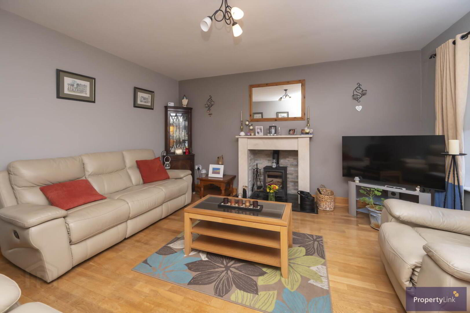 Spacious frontal aspect room offering laminate wooden floor and feature fireplace with wood burning stove.