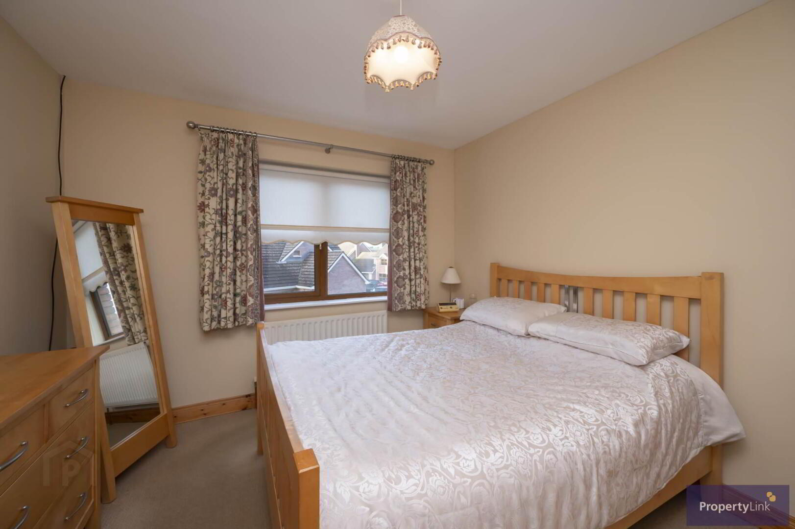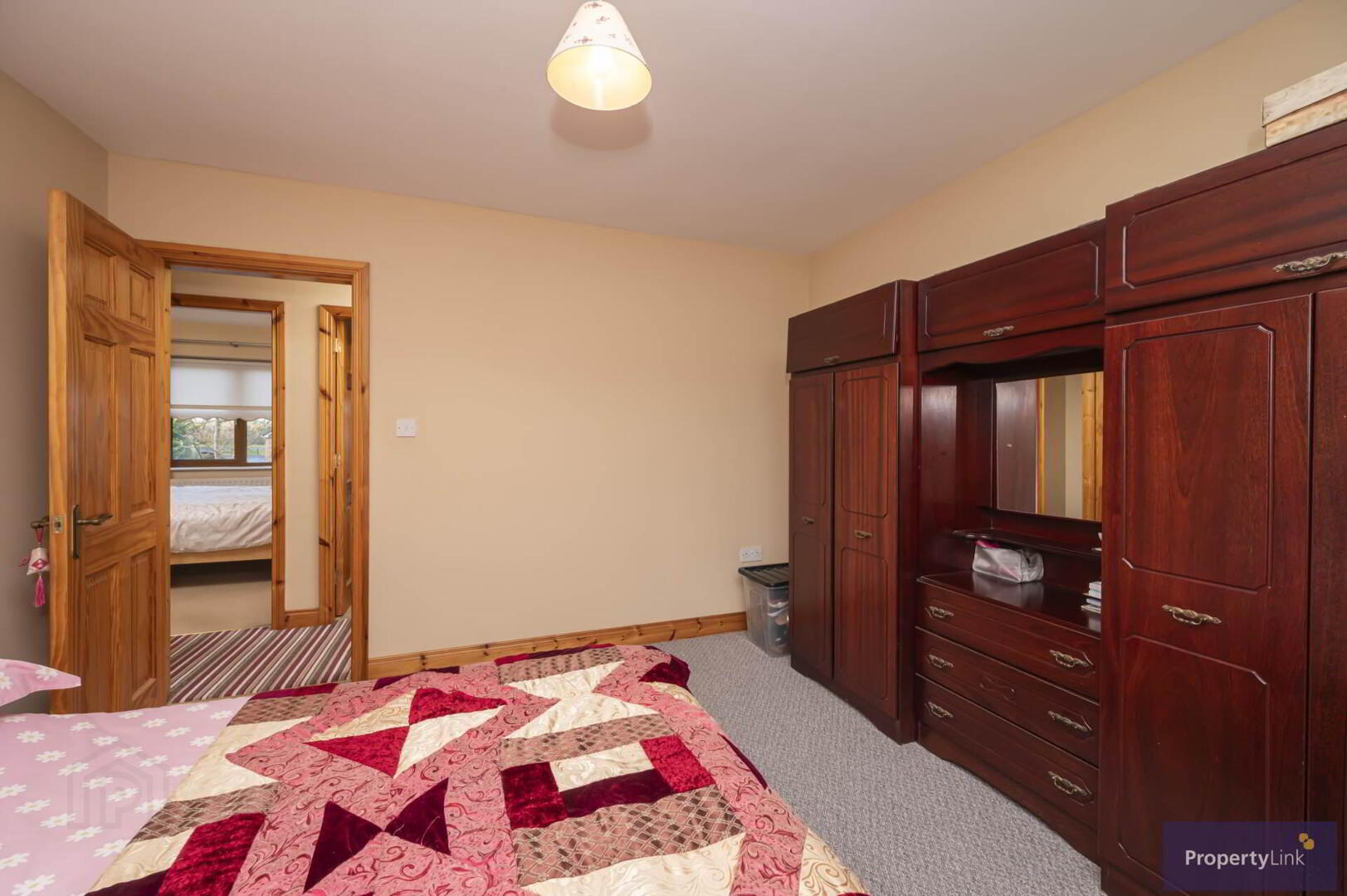 Generous frontal aspect room offering carpet floor covering and en-suite to include sink in vanity, low flush WC, electric shower and ceramic tiled floor.
