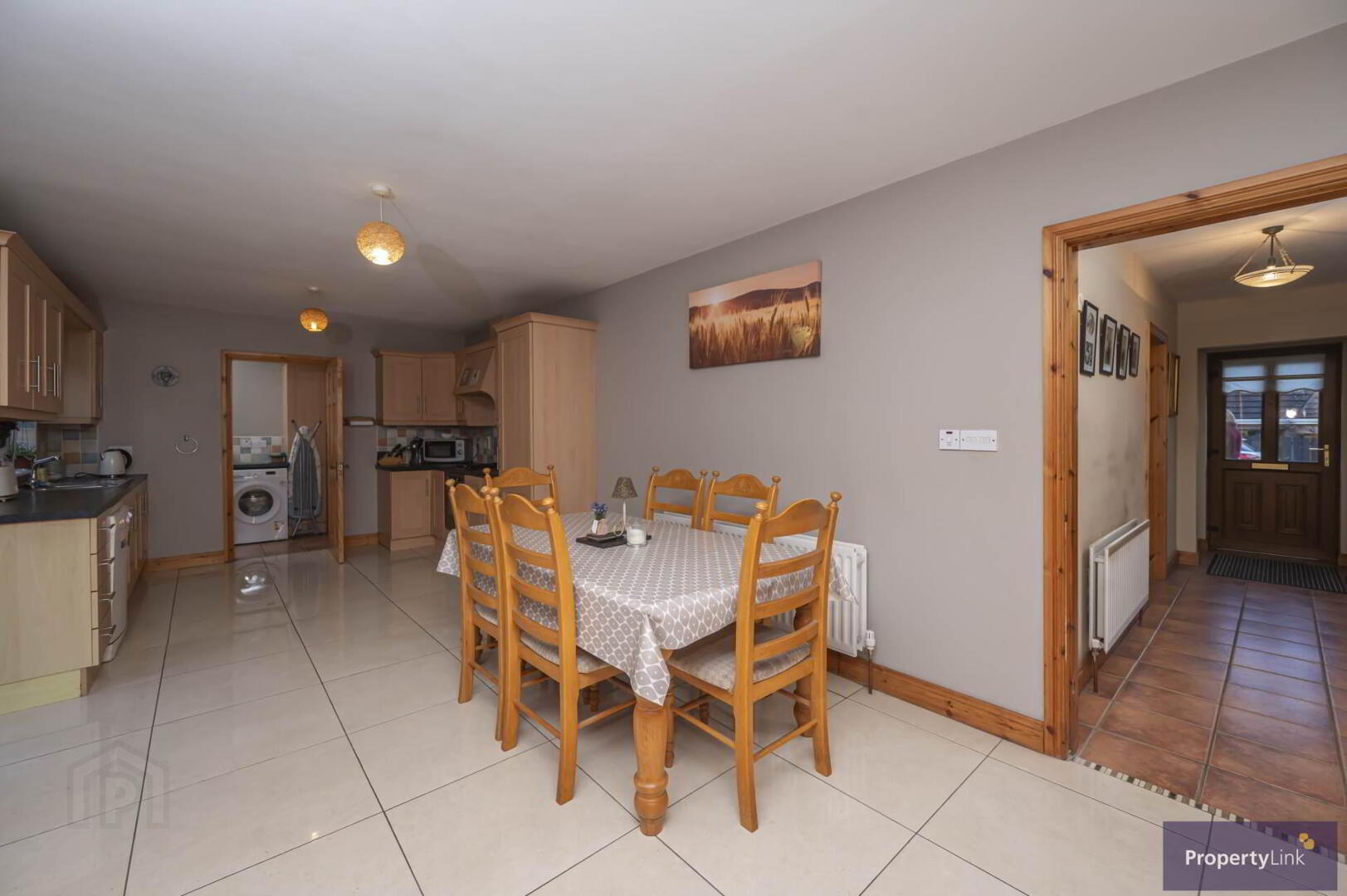 Offering fitted units to include stainless steel sink and drainer, space to house auto washers, ceramic tiled floor and PVC rear door.