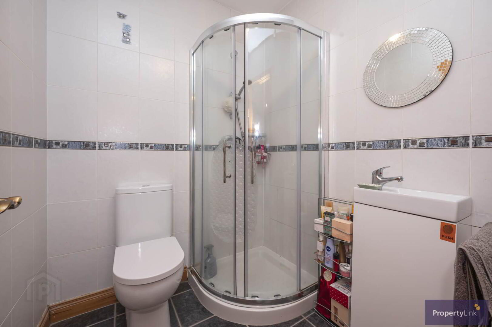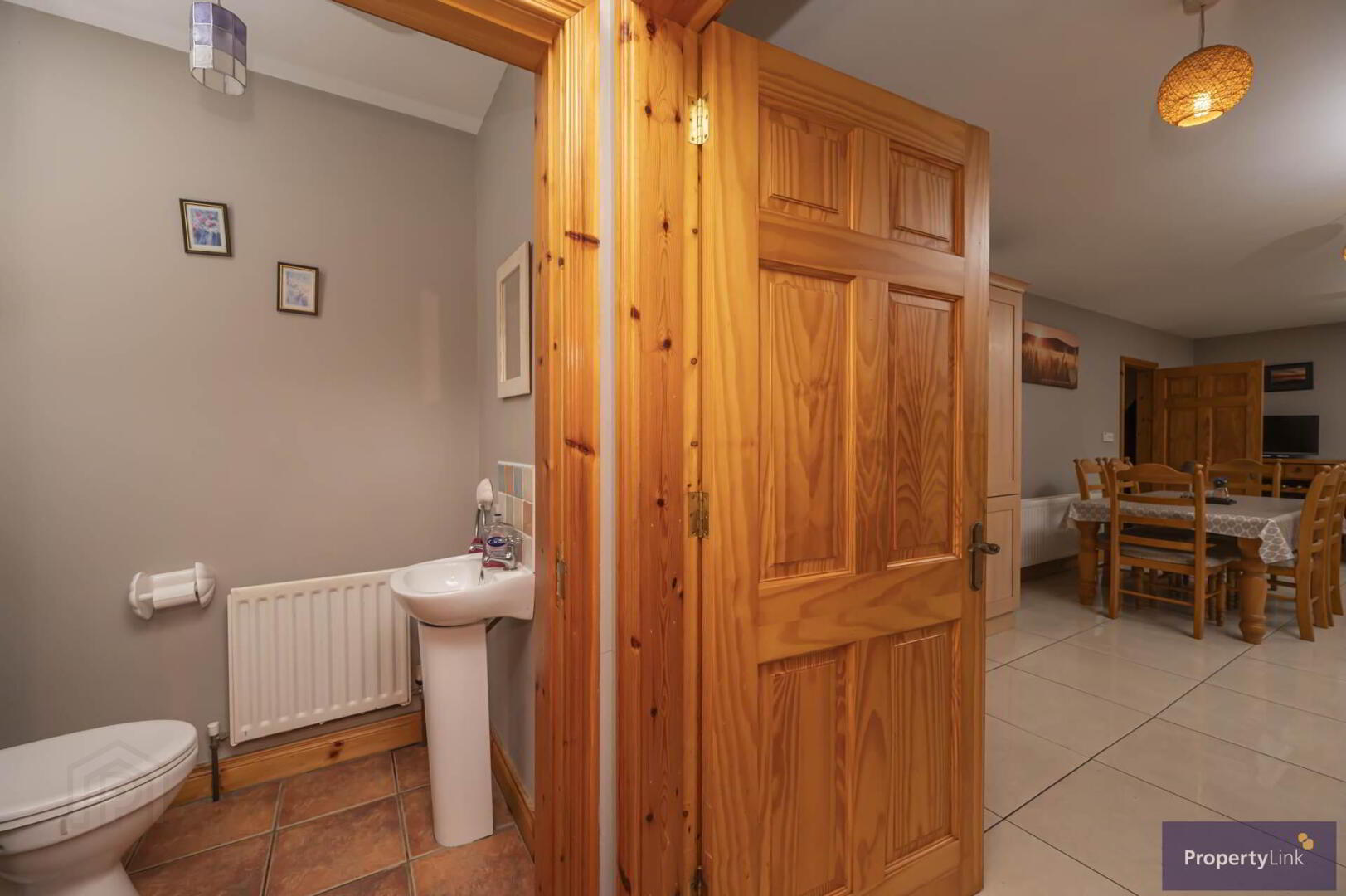 Composing of pedestal wash hand basin, low flush WC and ceramic tiled floor.