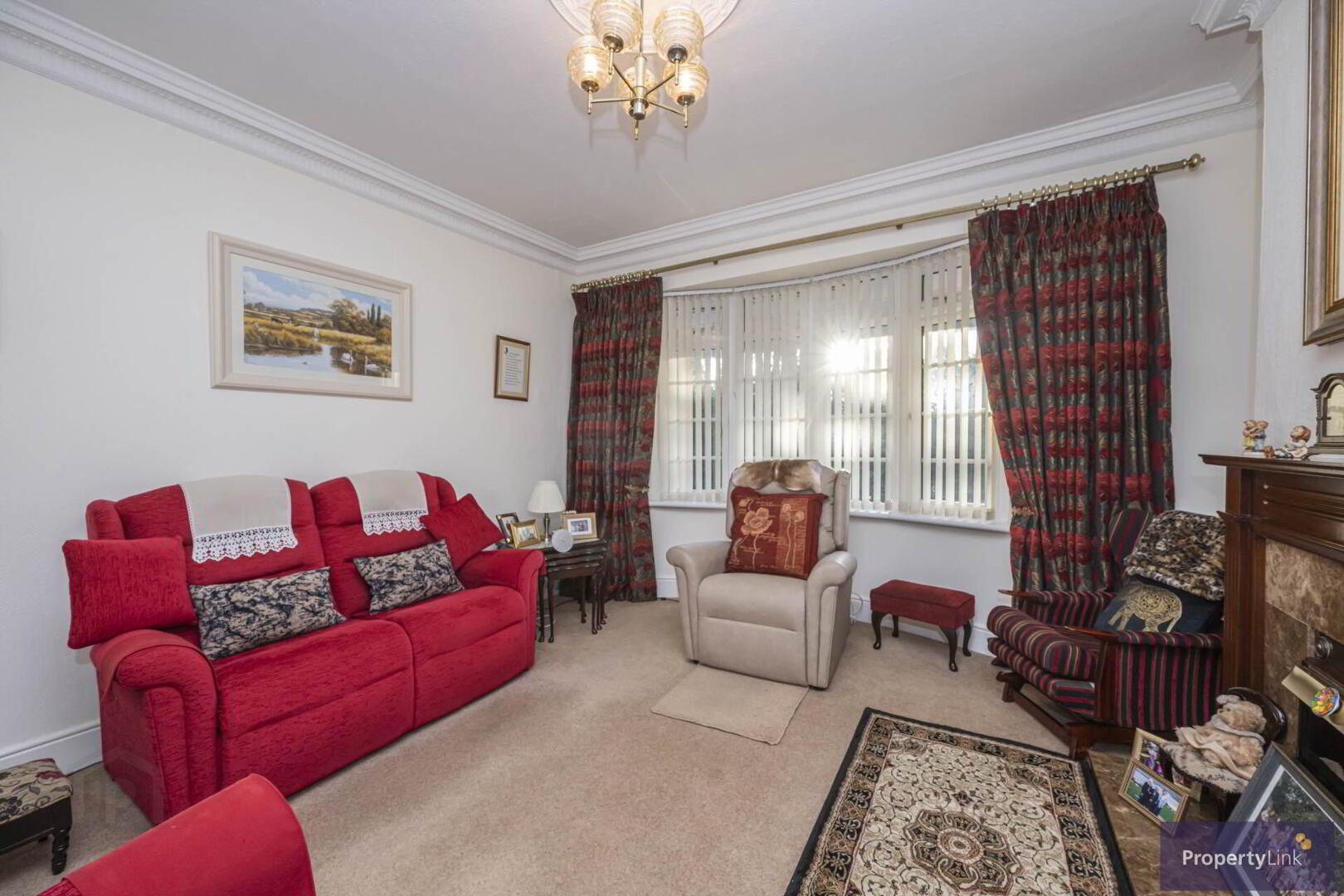 A second generous reception room offering access to both the kitchen and entrance hall, carpet floor covering, frontal aspect window views and feature mahogany fire place.