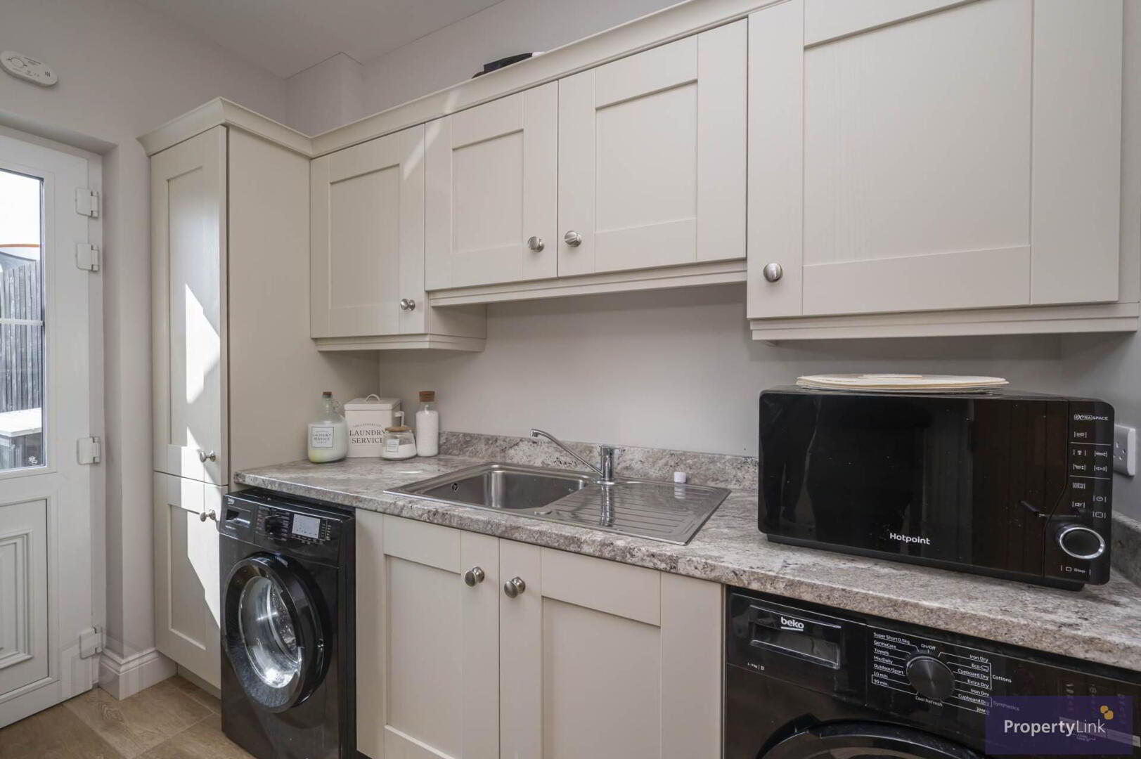 Composing of high and low level fitted units to include stainless steel sink and drainer, space to house two auto washers, PVC rear door, WC off and ceramic tiled floor.