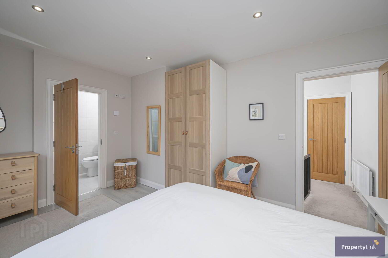 A spacious frontal aspect bedroom offering laminated wooden floor, ample space to house double bed and en-suite to include shower with rain head, sink in vanity, low flush WC and ceramic tiled floor and walls