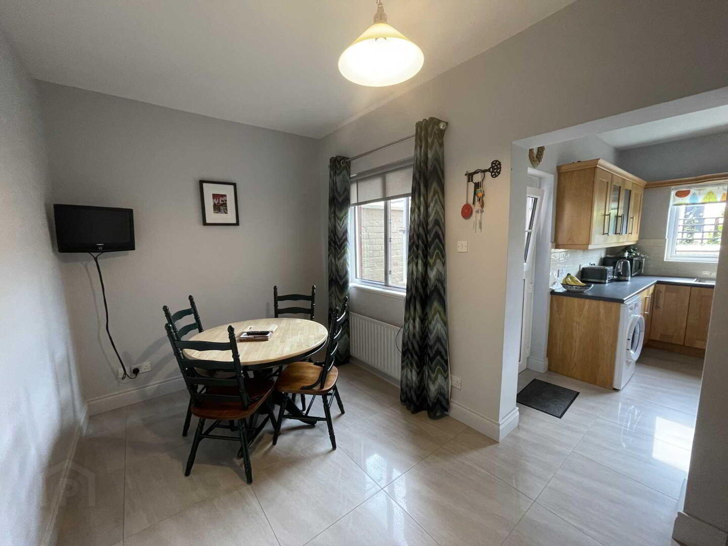 Open plan to kitchen with built in wooden side board complete with ceramic tiles.