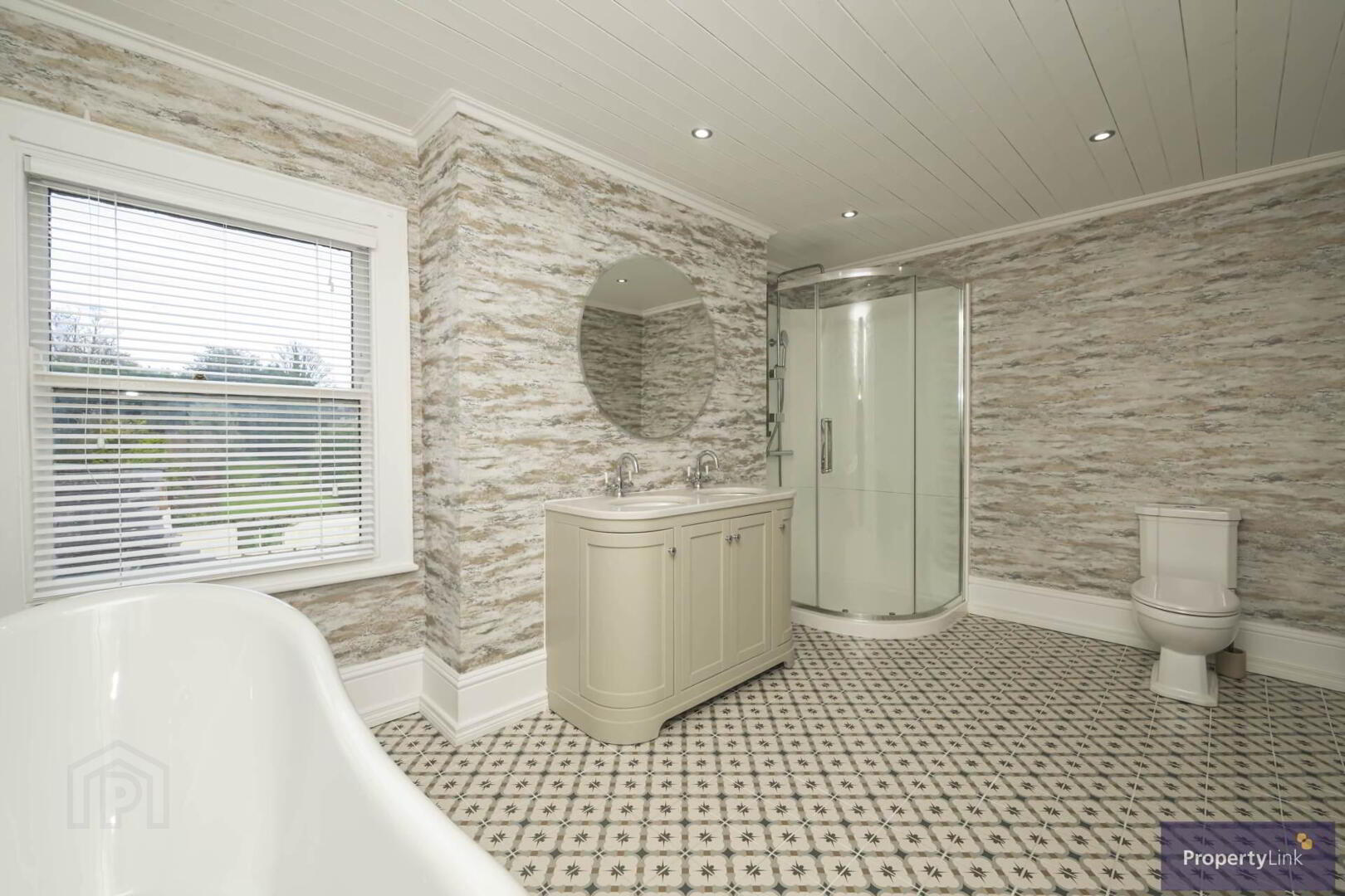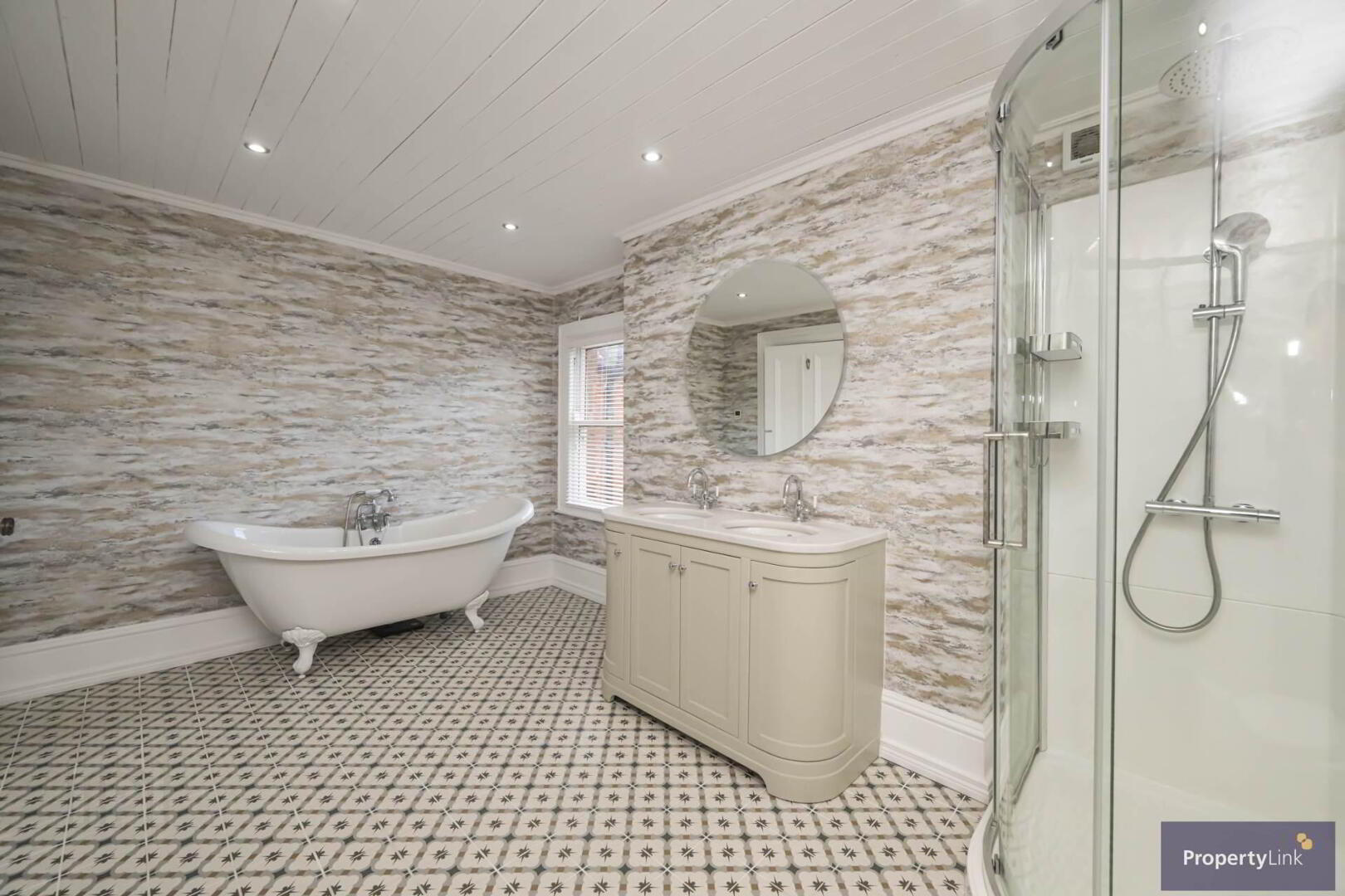 Beautifully presented offering a blend of style and functionality, offering a sleek vanity unit with twin sinks, modern shower pod for easy maintenance, contemporary low flush WC and free standing bath. The recessed ceiling lights, ceramic tiled floor, and quality finishes throughout complete this luxurious and thoughtfully designed space.