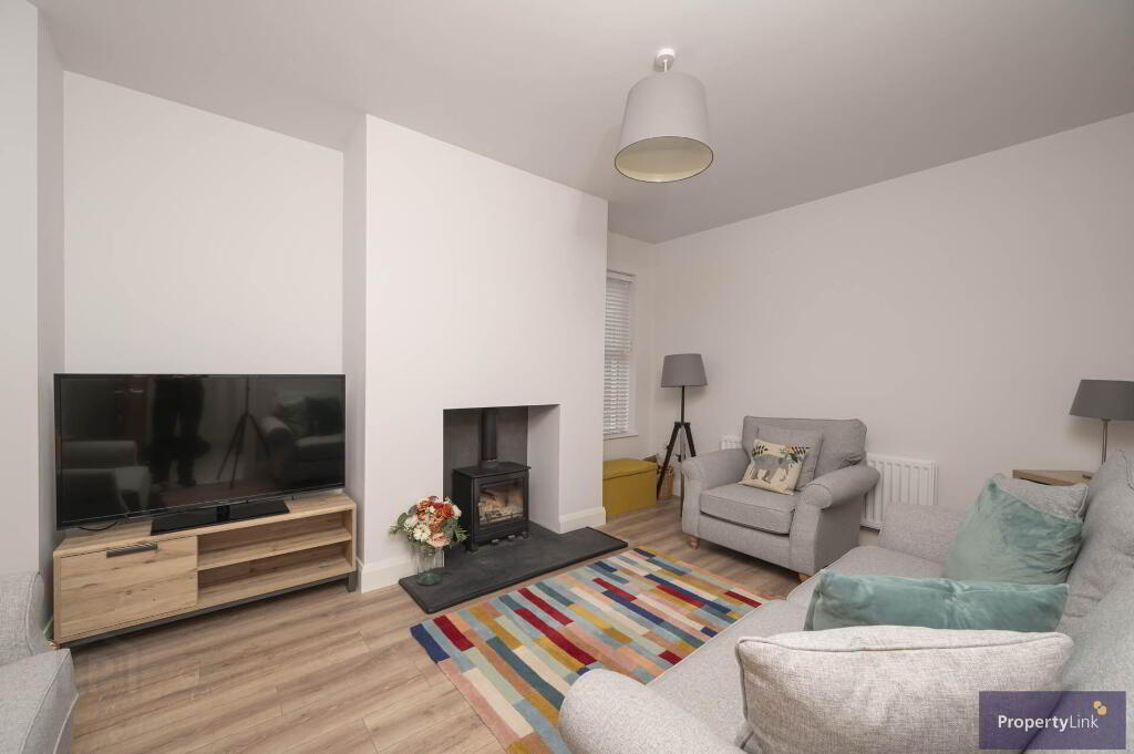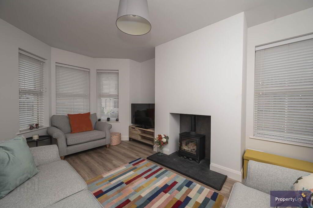 Frontal aspect reception room offering box bay window views, laminate wooden floor with feature multi fuel stove.