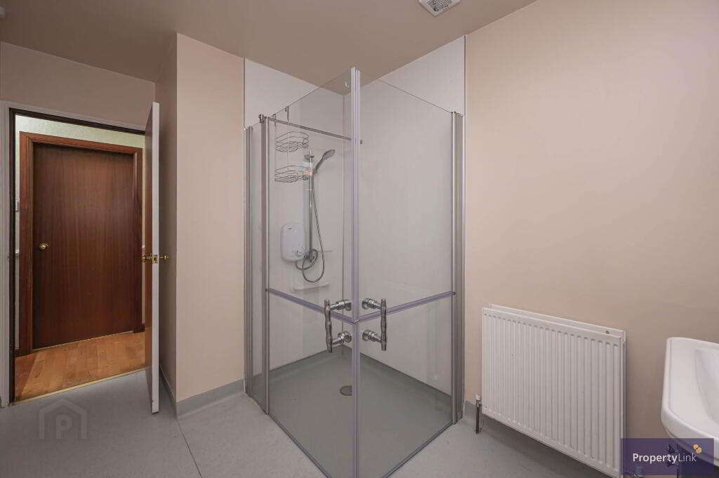 A three piece suite to include sink in vanity, low flush WC and walk in shower with wet room floor.
