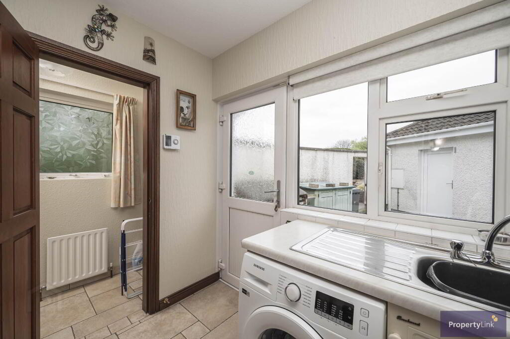 Composing of fitted units to include stainless steel sink and drainer, space to house auto-washers, ceramic tiled floor and PVC door to the rear. WC off.