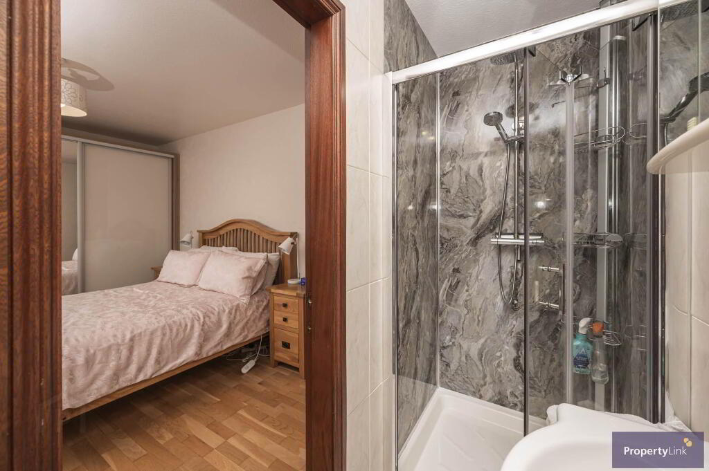 A generous double bedroom to include solid wooden floor, rear aspect window views , fitted wardrobes and en-suite to include electric shower with rain head, low flush WC , sink in vanity and ceramic tiled floor.