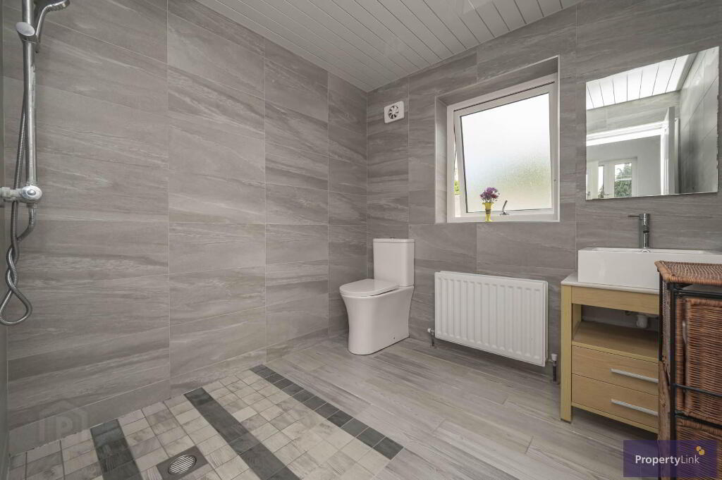 Composing of ceramic tiled floor and walls, sink in vanity unit, low flush WC, shower with rain head and ceramic tiled floor and walls.