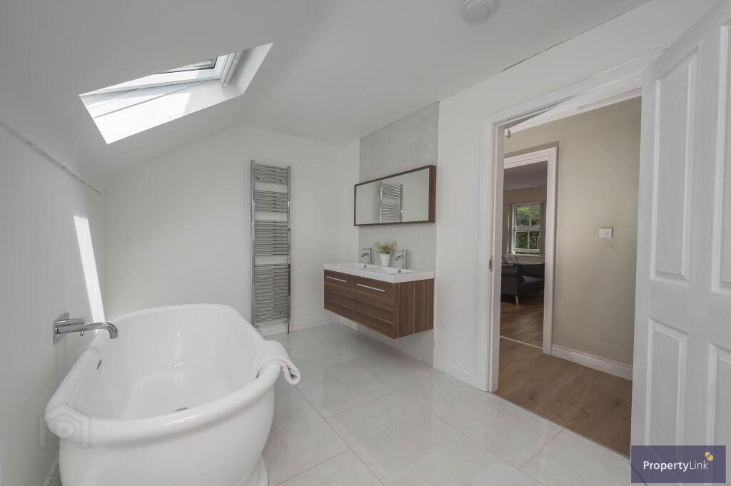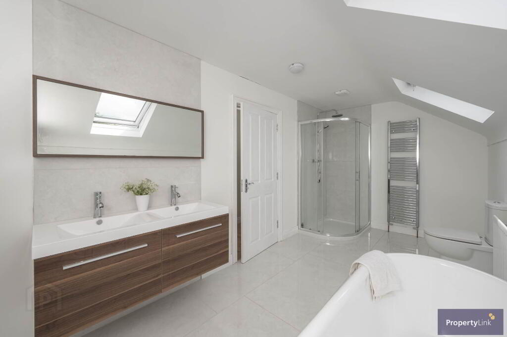 Four piece suite to include double sink in vanity, free standing bath with mixer taps, electric shower with rain head, low flush WC and ceramic tiled floor.