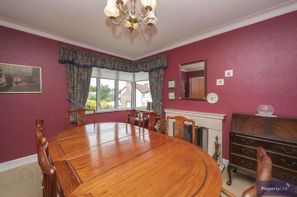 A frontal aspect dining room offering carpet floor covering and marble fireplace with open fire.
