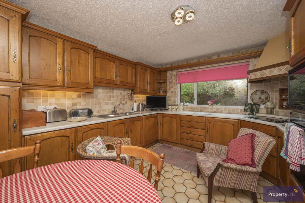Offering high and low fitted units to include electric oven with hob and extractor fan over, stainless steel sink and drainer, intergrated fridge, ample space to house dining table, ceramic tiled floor and rear aspect window views.