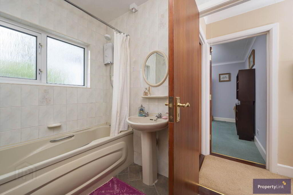 Two piece suite to include pedestal wash hand basin, panel bath with electric shower over, ceramic tiled floor and hotpress.