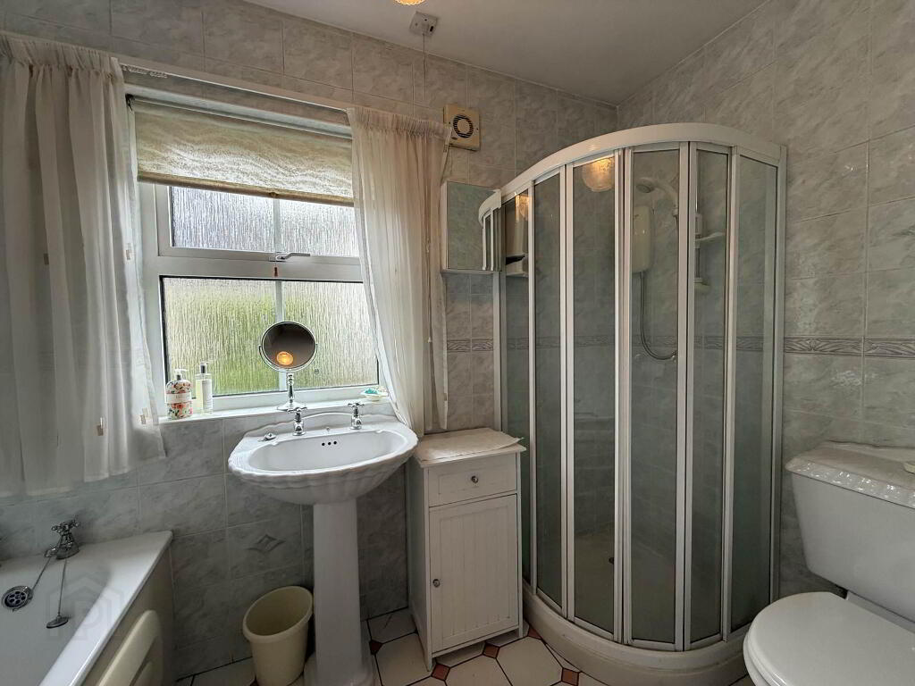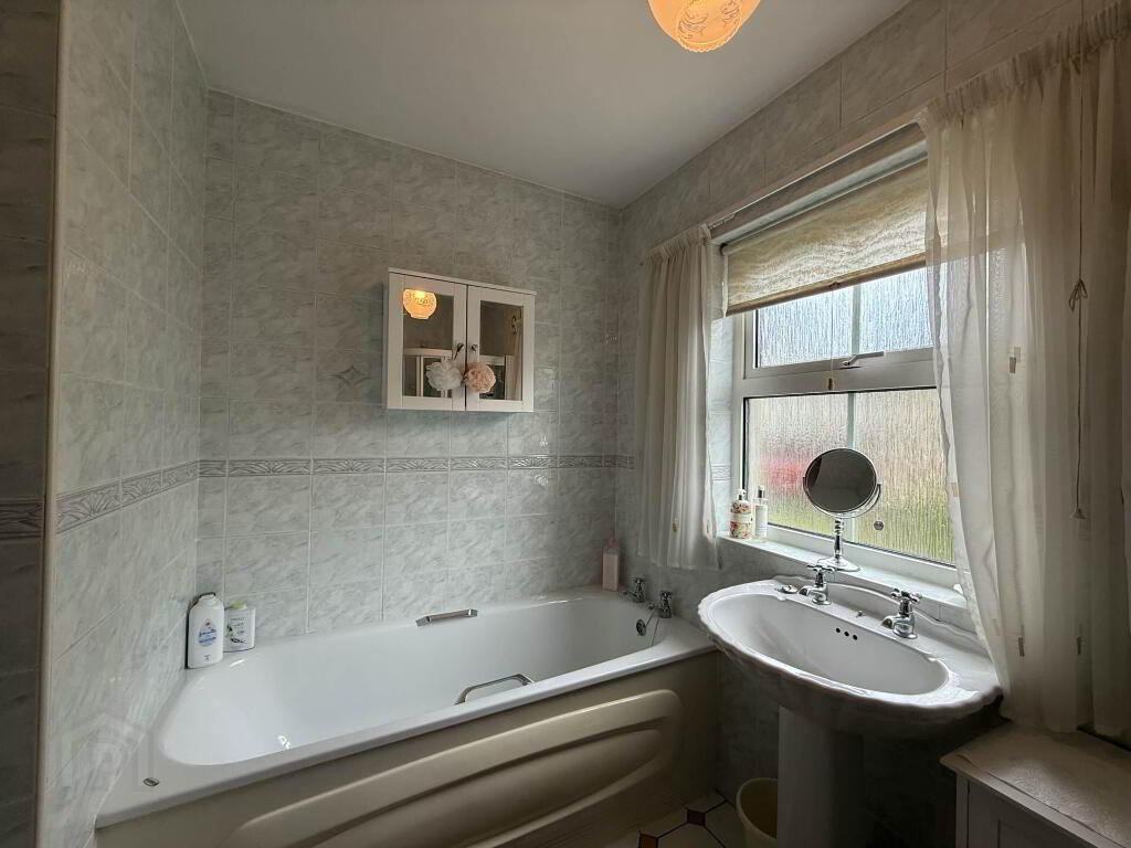 Bathroom - 9'9" (2.97m) x 9'4" (2.84m) Four piece suite to include ceramic tiled floor and walls, pedestal wash hand basin, low flush WC, panel bath and electric shower.
