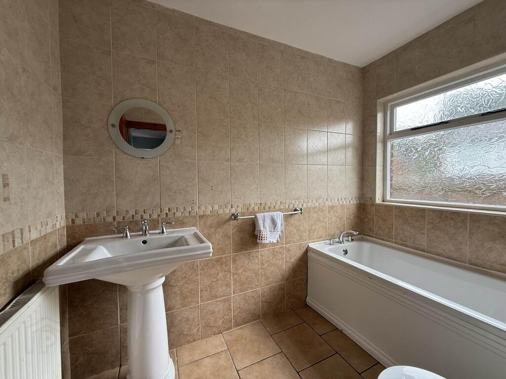 Bathroom - 8'2" (2.49m) x 5'9" (1.75m) Ground floor bathroom to include pedestal wash hand basin, low flush WC, panel bath and ceramic tiled floor.