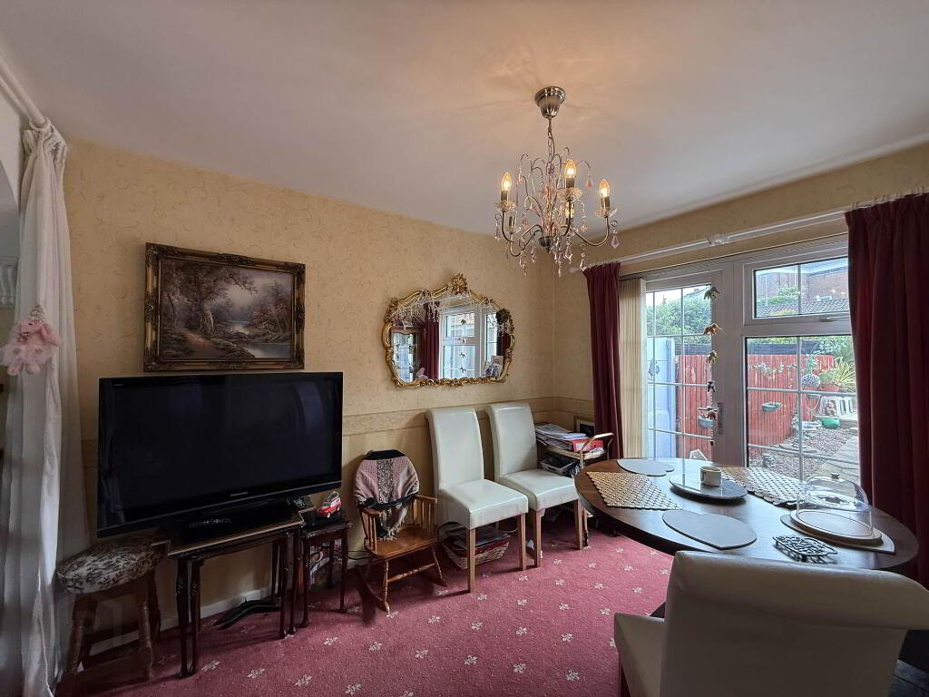 Rear aspect room leading to the kitchen, offering carpet floor covering and glass door to patio area.