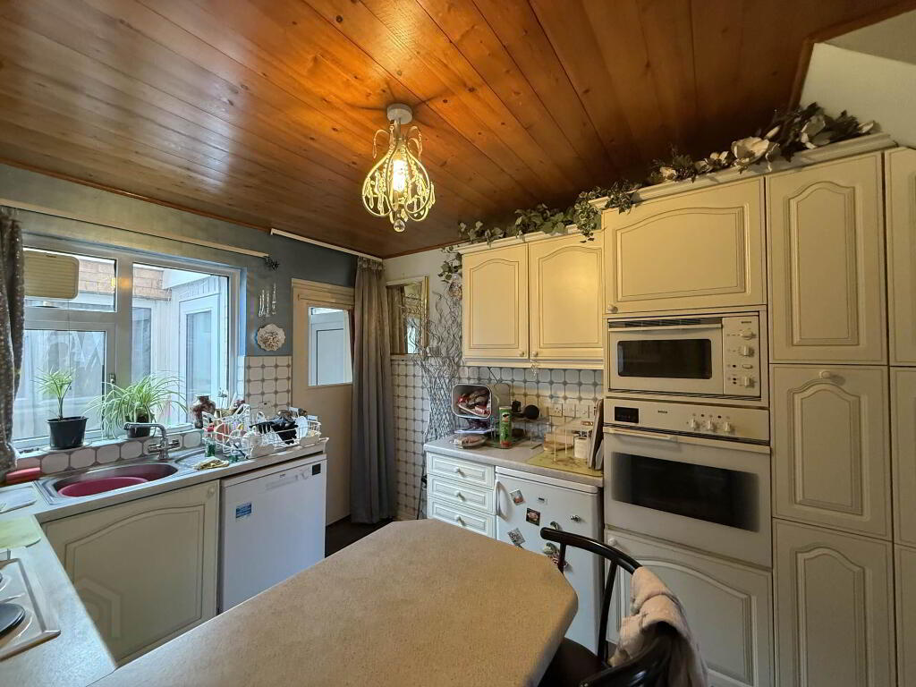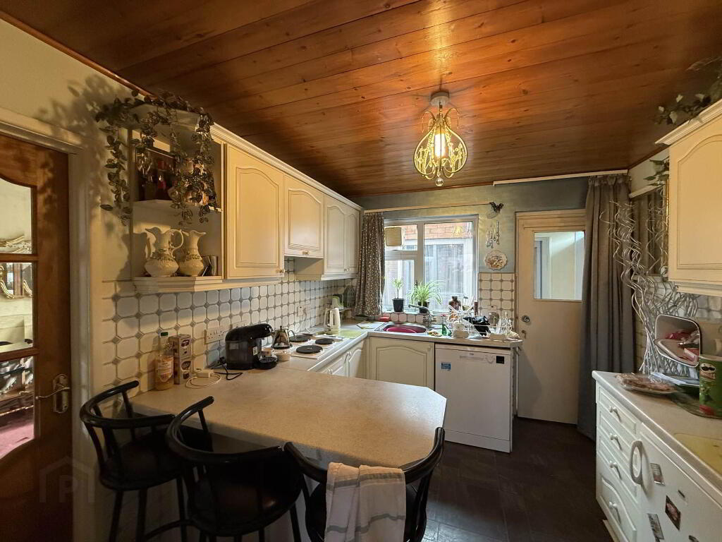 Offering high and low level fitted units to include stainless steel sink and drainer, intergrated microwave and electric oven, electric hob with extractor fan over, space to house fridge and dishwasher, rear aspect window views and lino floor covering.