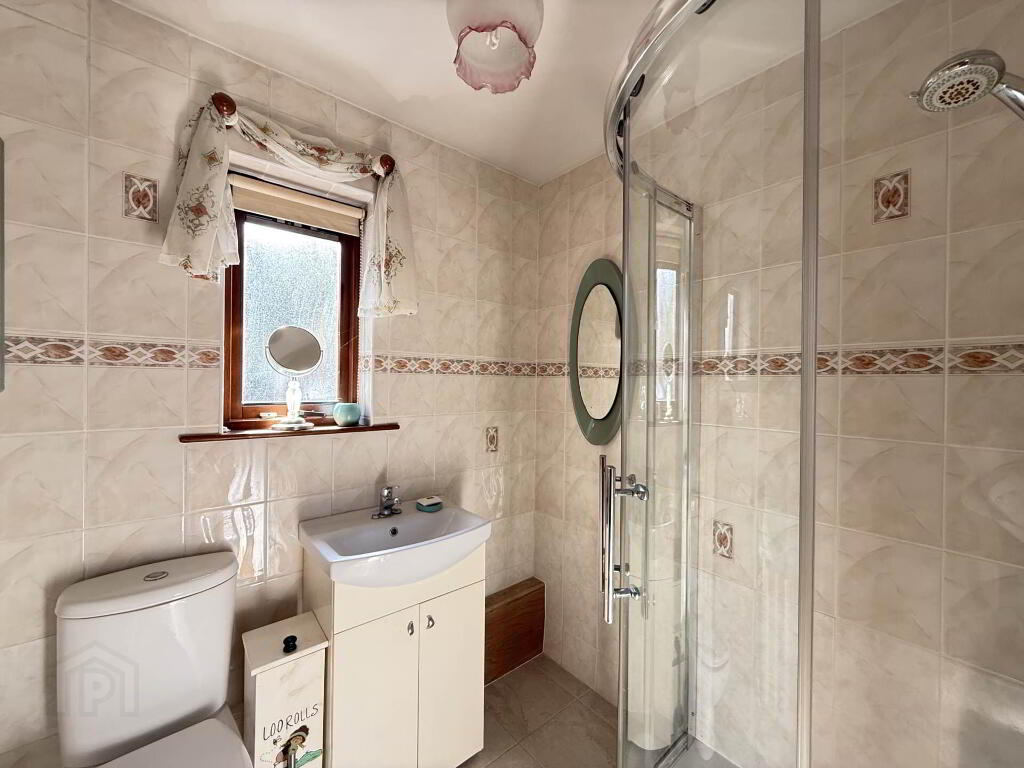 Bathroom - 5'8" (1.73m) x 5'5" (1.65m) Three piece suite to include pedestal wash hand basin, low flush WC and electric shower. Ceramic tiled floor and walls.