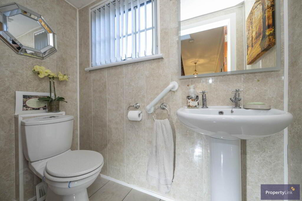 Composing of pedestal wash hand basin, low flush wc, ceramic tiled floor and walls.