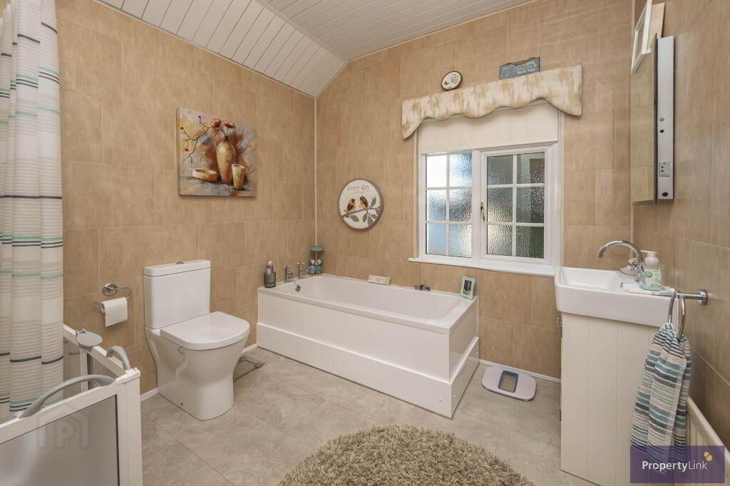 Four piece suite to include panel bath, low flush WC, walk in shower, sink in vanity and PVC floor and walls.