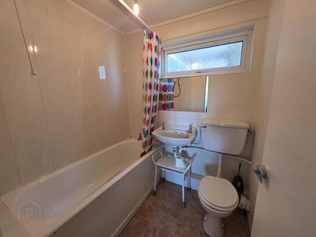 Bathroom - 6'1" (1.85m) x 5'7" (1.7m) Three piece to include panel bath with shower over, floating wash hand basin, low flush WC and lino floor covering