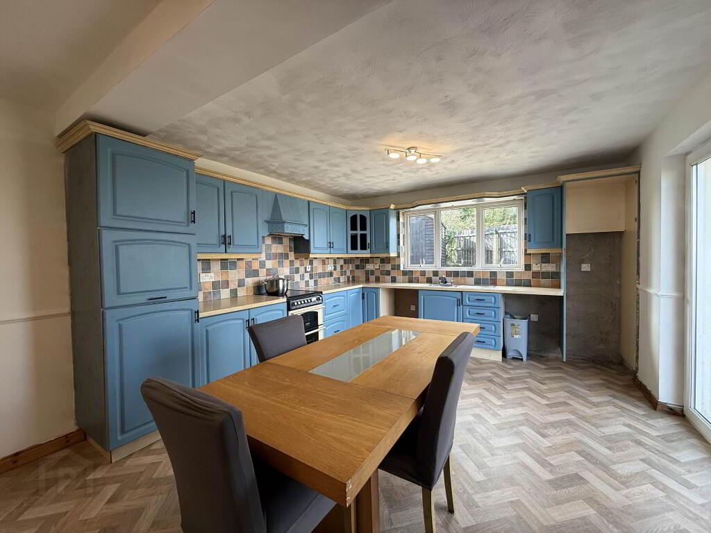 Kitchen/Dining Area - 19'4" (5.89m) x 12'3" (3.73m) Composing of fitted units to include stainless steel sink and drainer, space to house cooker, fridge/freezer, auto-washers, lino floor covering, sliding doors to the outside rear, and ample space to house dining table.