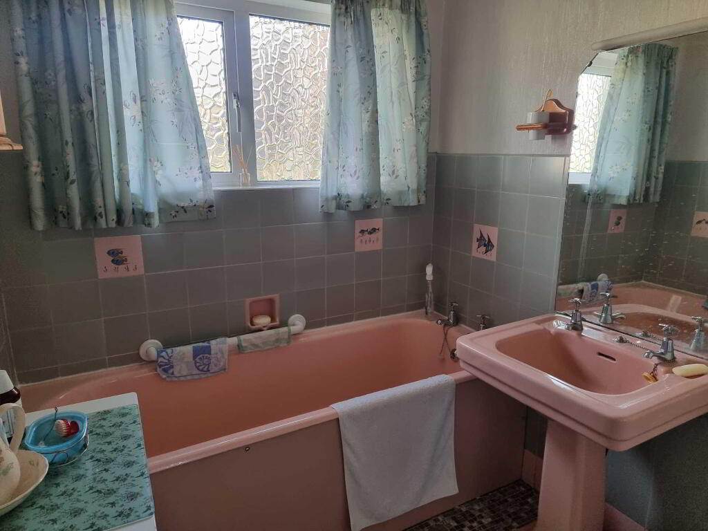 Bathroom - 7'4" (2.24m) x 5'5" (1.65m) Coloured bathroom suite, cast iron bath, pedestal wash hand basin, part tiled walls, shelved hot press.