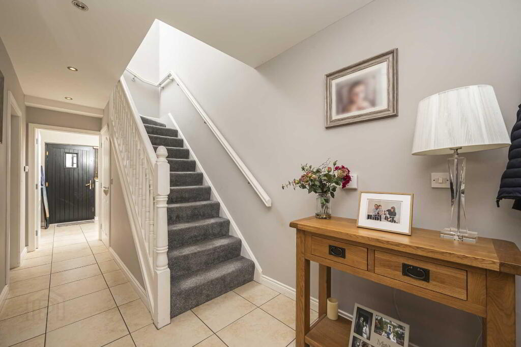 Entrance Hall Entered through a PVC door with glass side panel, ceramic tiled floor, ceiling spot lights, downstairs WC with pedestal wash had basin and low flush WC.