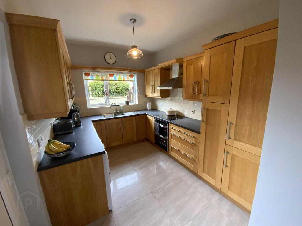 Kitchen - 11'3" (3.43m) x 8'5" (2.57m) Spacious kitchen area with high and low level fitted oak units to include double oven with electric hob and extractor fan over, intergrated fridge freezer and dishwasher, space for washing machine, pull out larder complete with part tiled walls and tiled floor.