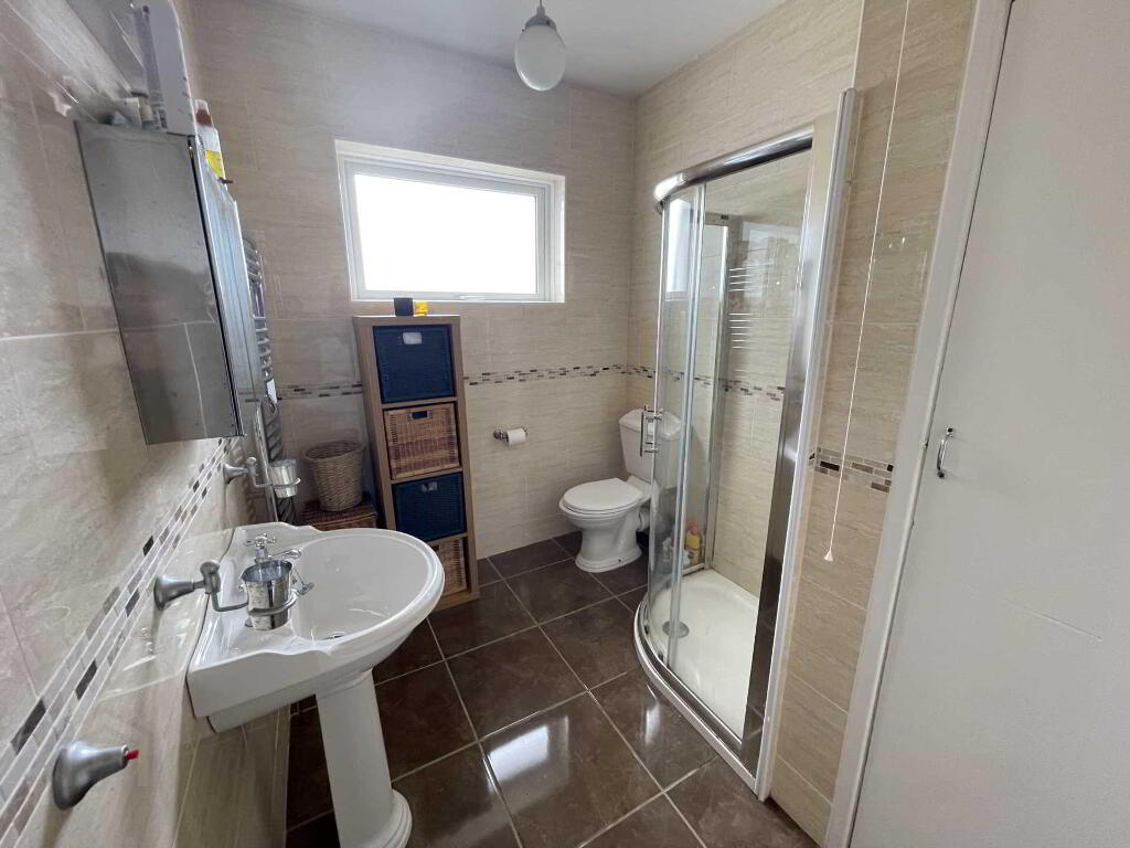 Bathroom - 9'5" (2.87m) x 6'10" (2.08m) Three piece bathroom suite offering corner shower, low flush WC, and pedestal wash hand basin, chrome towel rail and fully tiled.