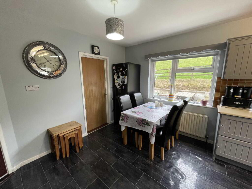 Kitchen - 17'1" (5.21m) x 12'7" (3.84m) Spacious kitchen with high and low level grey painted units to include, stainless steel sink and drainer, space for cooker and fridge, part tiled walls, lino floor covering, free standing dresser with ample space to house dining table.