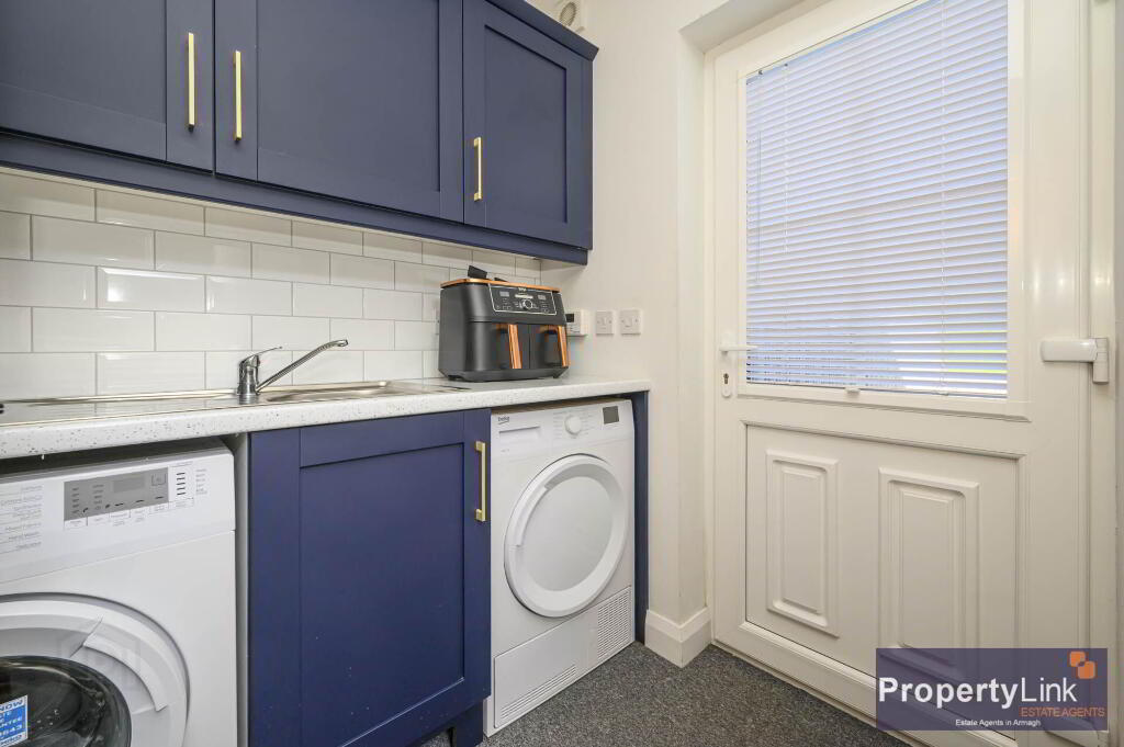 Utility Room - 8'1" (2.46m) x 5'6" (1.68m) Composing of high and low level fitted units to include space to house two auto washers, PVC door leading to outside and ceramic tiled floor.